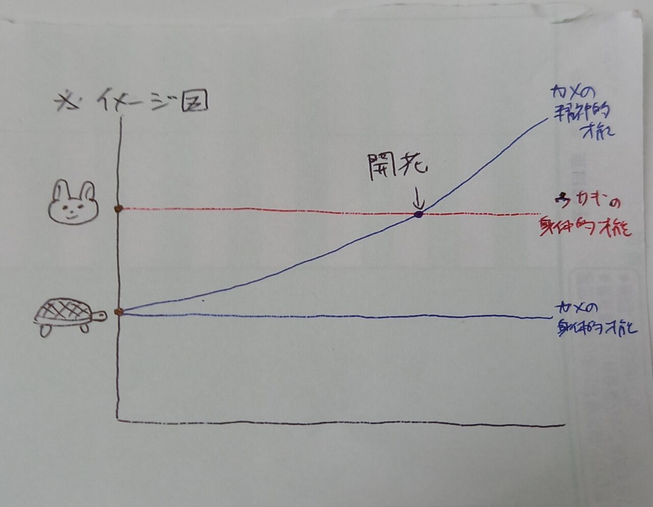 身体的才能は先天的に決まっているものなので横一直線です。仮に身体的才能の高い人と低い人のグラフを書きます。